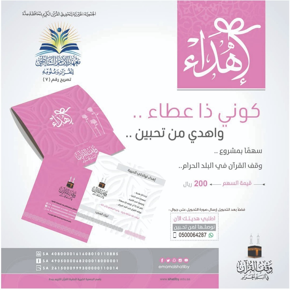 https://i.suar.me/8AweE/l فرصة لترك الأثر والصدقة الجارية معهد الامام الشاطبي للقرآن وعلومه تصريح رقم (٧) وقف القرآن في بلد الحرام موقع الوقف داخل حد الحرم- مخطط الحمراء - طريق الممشى عدد الأسهم ٣٢٠٠سهم قيمة السهم ١٠٠٠ ريال يمكن التبرع بأي مبلغ يصرف الوقف علي: - تخريج معلمين ومعلمات حاصلين على دبلوم القرآن الكريم. -تخريج طلاب وطالبات حاصلين على دبلوم القراءات. -تأهيل متخصصين ومتخصصات قرآنيا في القرى والهجر. - طباعة كتب متخصصة في الدراسات القرآنية. نستقبل مساهماتكم علي الحسابات التالية (باسم - الجمعية الخيرية لتحفيظ القرآن الكريم ) : بنك الراجحي: SA4080000-161608010110885 بنك الانماء: SA49050000-68200018000001 بنك البلاد: SA261500-0999300000110014 فضلا بعد التحويل ارسال صورة التحويل علي الجوال: http://api.whatsapp.com/send?phone=+966500064287 انشر تؤجر https://i.suar.me/34r24/l |